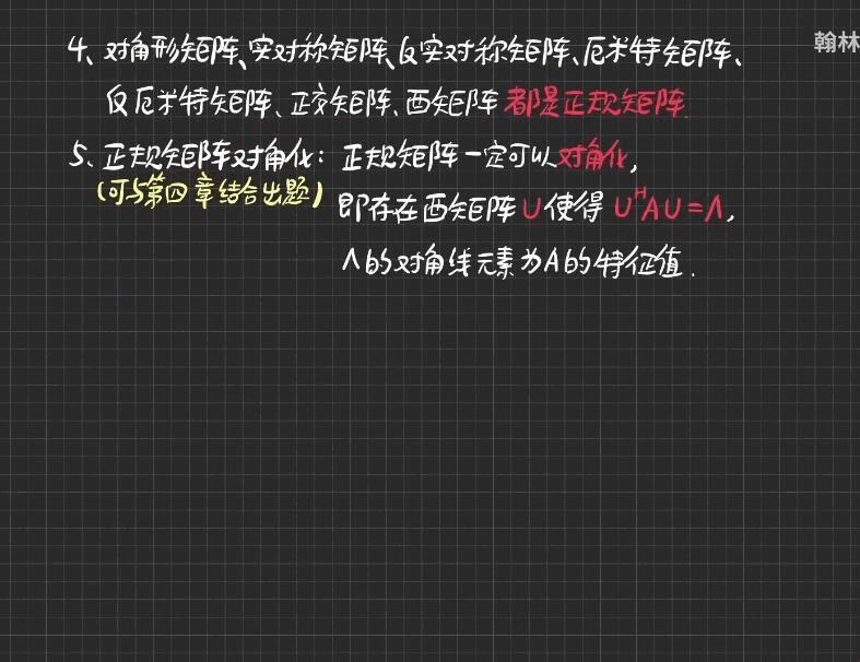 3.厄米特矩阵可以通过酉相似变换对角化。这意味着可以找到一个酉矩阵,将厄米特矩阵相似变换为一个对角矩阵,即将矩阵的非对角线上的元素全部变为零。
