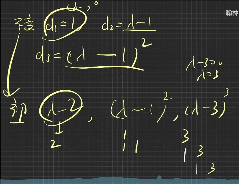 如果有 \(d_{4}=(\lambda-2)^{2}(\lambda-1)\) 的话,要拆成:\((\lambda-2)^{2}\) 和 \((\lambda-1)\),一定要拆成两个,否则结果是不对的。